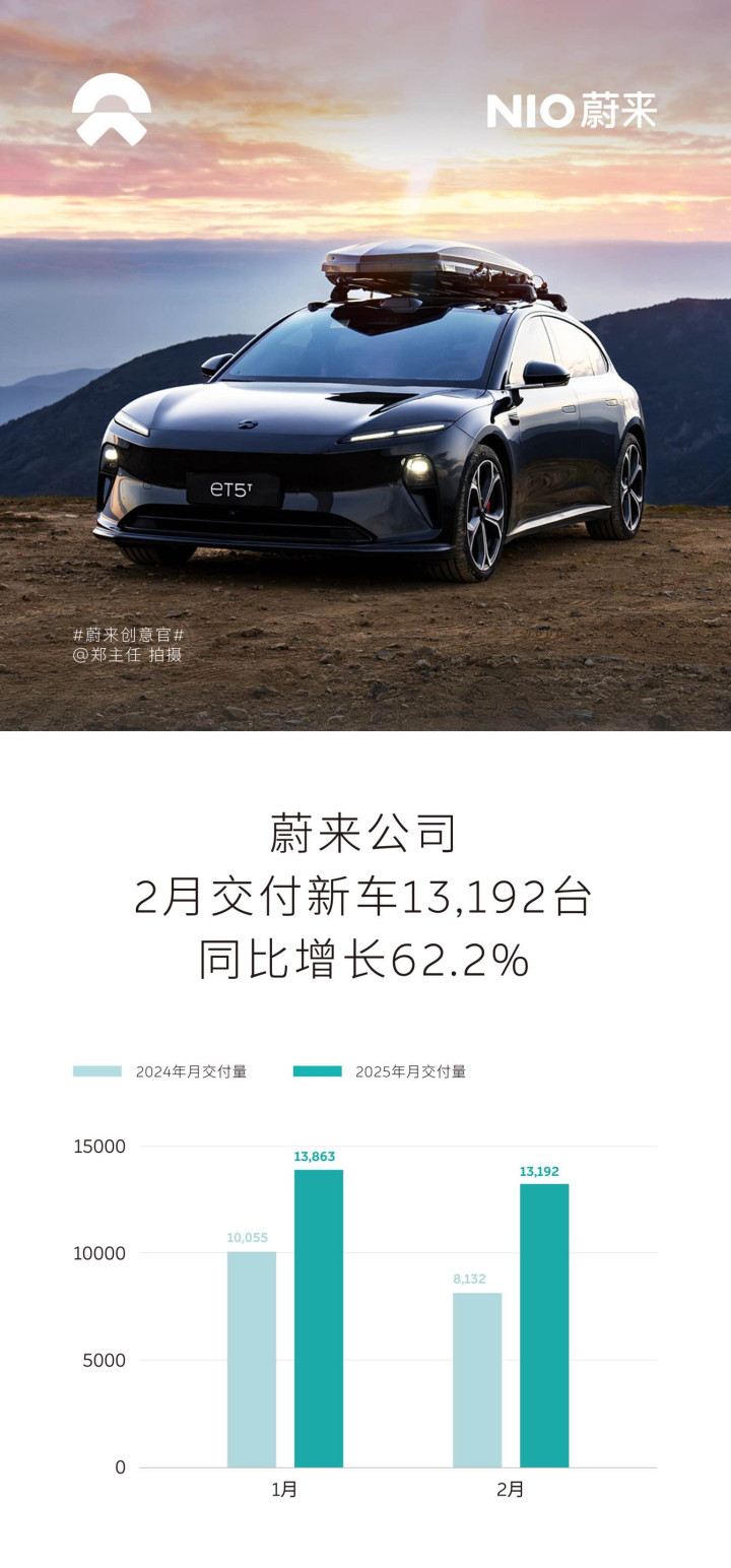 蔚来2月交付新车13, 192台, 同比增长62.2%